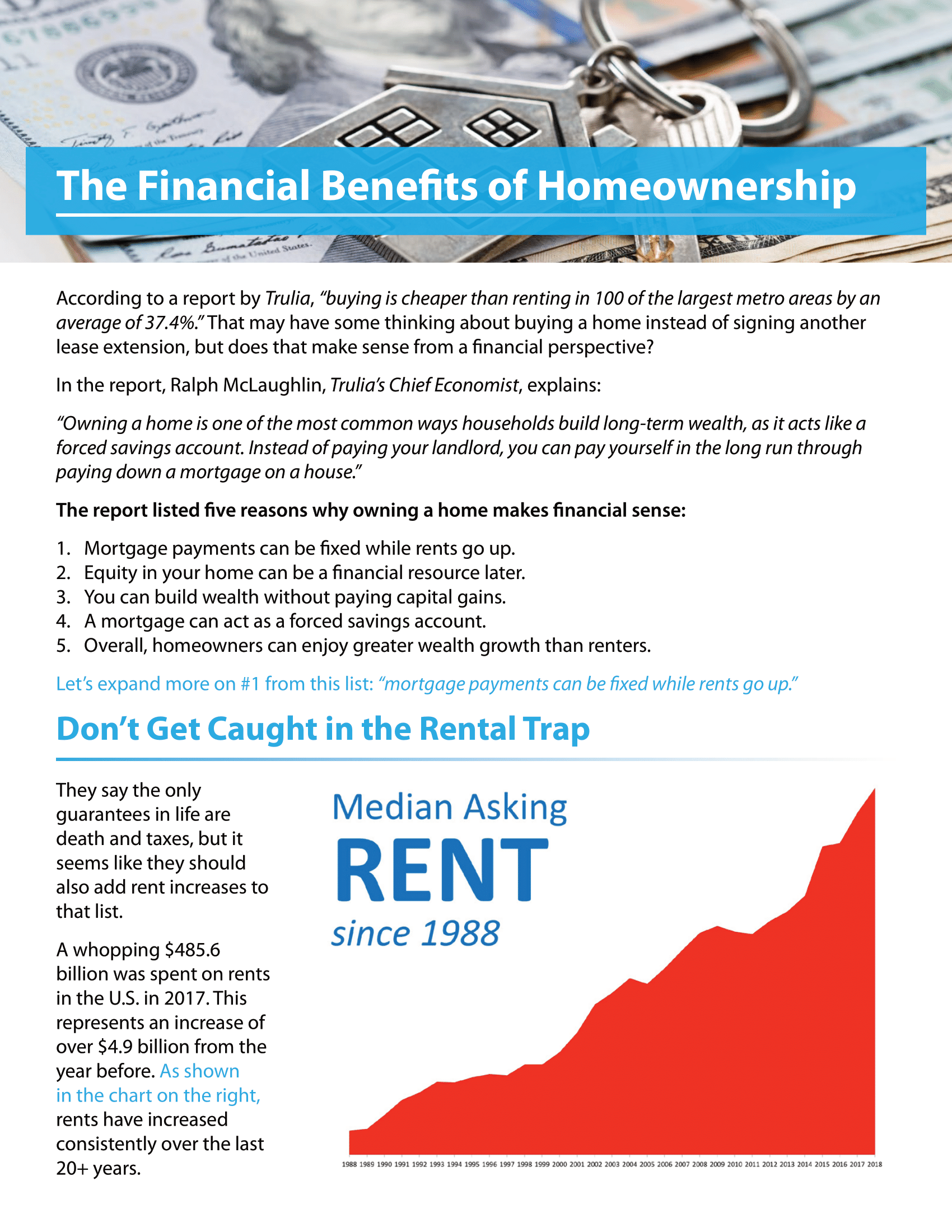 Eric Belsky is Managing Director of the Joint Center of Housing Studies at Harvard University. He also currently serves on the editorial board of the Journal of Housing Research and Housing Policy Debate. This year he released a new paper on homeownership - The Dream Lives On: the Future of Homeownership in America . In his paper, Belsky reveals five financial reasons people should consider buying a home. Here are the five reasons, each followed by an excerpt from the study: 1.) Housing is typically the one leveraged investment available. “Few households are interested in borrowing money to buy stocks and bonds and few lenders are willing to lend them the money. As a result, homeownership allows households to amplify any appreciation on the value of their homes by a leverage factor. Even a hefty 20 percent down payment results in a leverage factor of five so that every percentage point rise in the value of the home is a 5 percent return on their equity. With many buyers putting 10 percent or less down, their leverage factor is 10 or more.” 2.) You're paying for housing whether you own or rent. “Homeowners pay debt service to pay down their own principal while households that rent pay down the principal of a landlord.” 3.) Owning is usually a form of “forced savings”. “Since many people have trouble saving and have to make a housing payment one way or the other, owning a home can overcome people’s tendency to defer savings to another day.” 4.) There are substantial tax benefits to owning. “Homeowners are able to deduct mortgage interest and property taxes from income...On top of all this, capital gains up to $250,000 are excluded from income for single filers and up to $500,000 for married couples if they sell their homes for a gain.” 5.) Owning is a hedge against inflation. “Housing costs and rents have tended over most time periods to go up at or higher than the rate of inflation, making owning an attractive proposition.” Bottom Line We realize that homeownership makes sense for many Americans for many social and family reasons. It also makes sense financially.