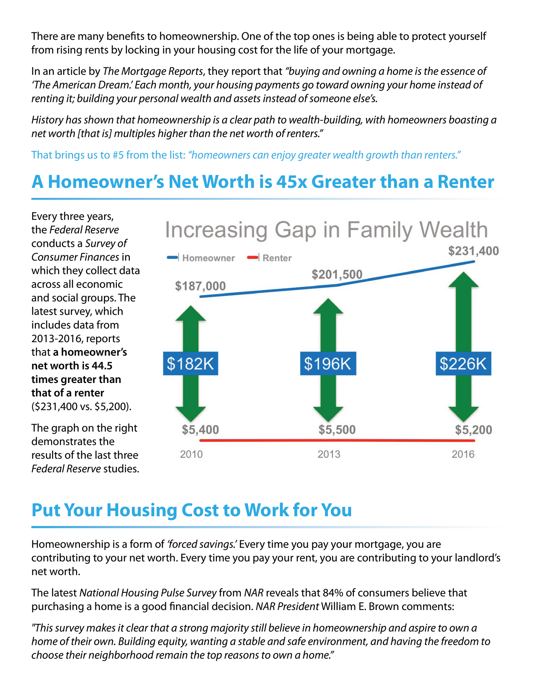 Some Highlights It’s worth considering the many benefits of homeownership before you make the decision to rent or buy a home. When you buy, you can stabilize your housing costs, own a tangible asset , and grow your net worth as you gain equity . When you rent, you face rising housing costs , won’t see a return on your investment, and limit your ability to save. If you want to learn more about the benefits of homeownership, let’s connect today.